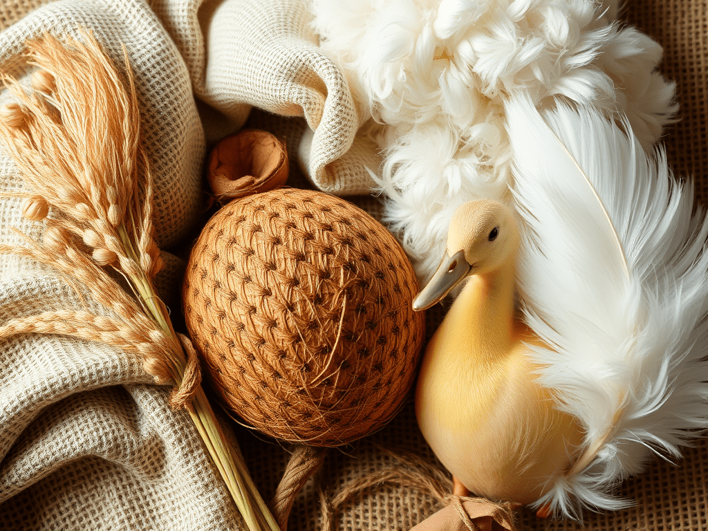- Down: Soft under-feathers of ducks and geese, used for insulation in quilts and jackets.