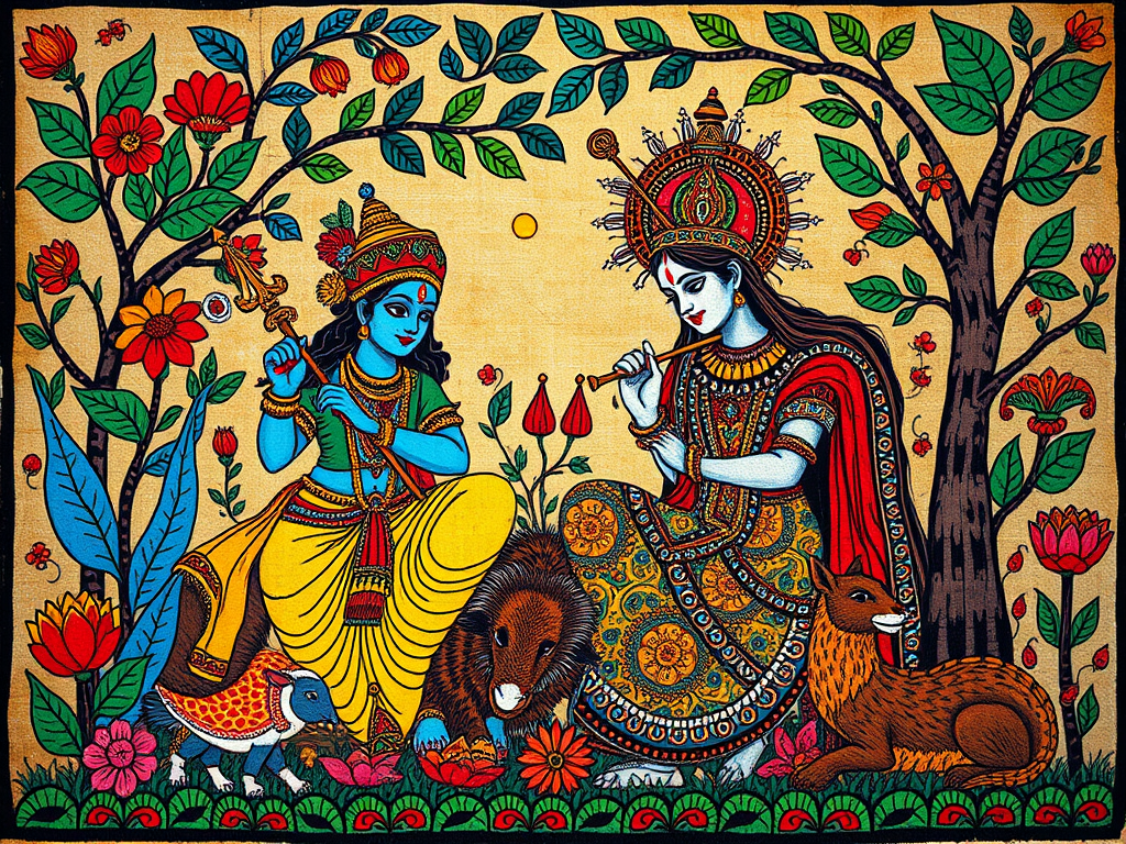 - Themes: Depict mythological stories (Hindu deities like Krishna, Rama, Shiva, Durga, Lakshmi, Saraswati), nature (sun, moon, plants, animals), social events (weddings, festivals), and philosophical dualisms.