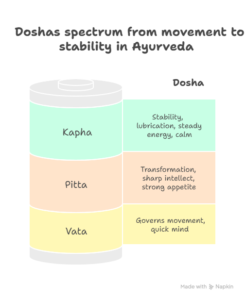 Kapha provides cohesiveness, hydration, and protection. 4 It lubricates joints, moisturizes skin, maintains immunity, and hydrates cells. Emotionally, it embodies love, compassion, and stability. Balanced Kapha ensures strong tissues and calm mind; excess causes congestion, deficiency leads to dryness.