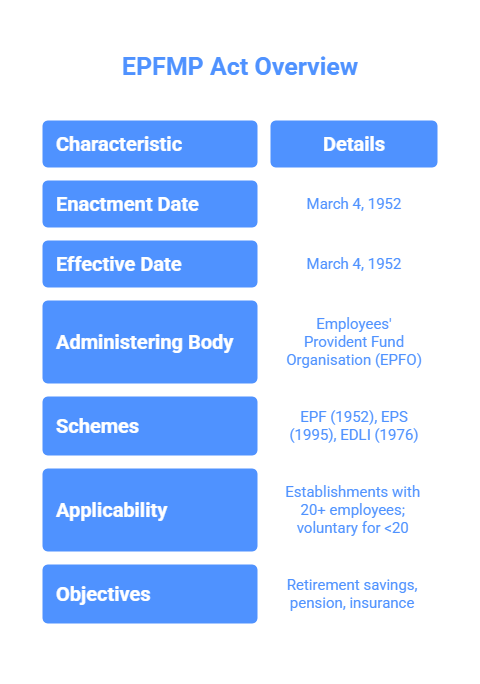 The Employees’ Provident Funds and Miscellaneous Provisions Act, 1952 (EPFMP Act), is a pivotal social security legislation in India, designed to provide financial stability to employees in the organized sector by ensuring retirement benefits, pension, and insurance. Enacted on March 4, 1952, and effective from the same year, the Act establishes three key schemes: