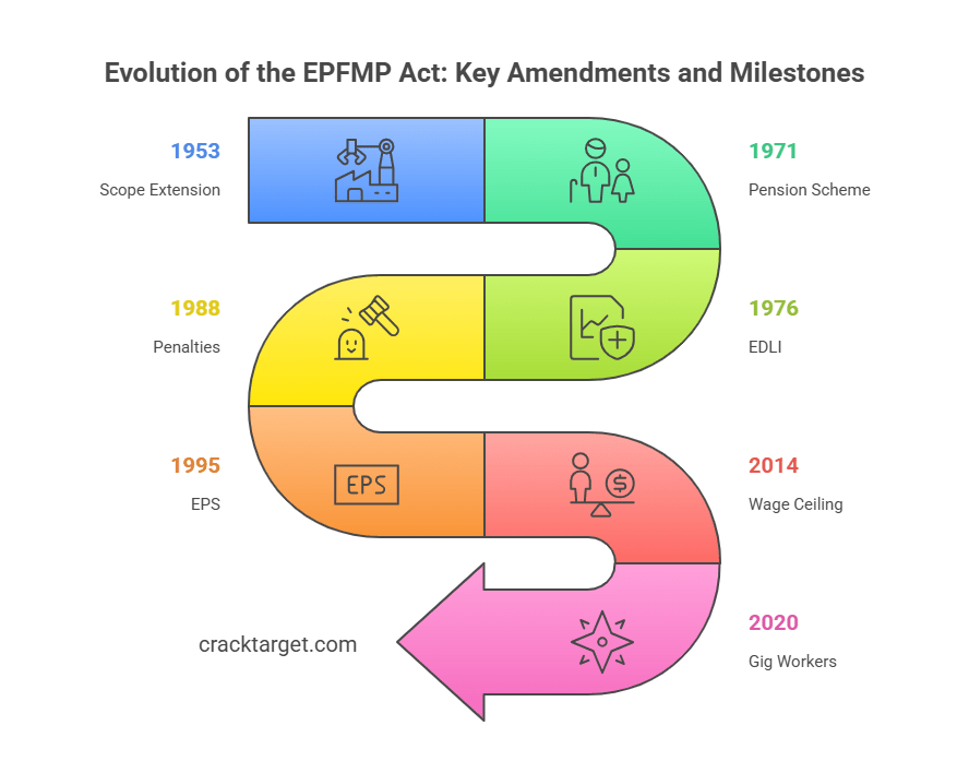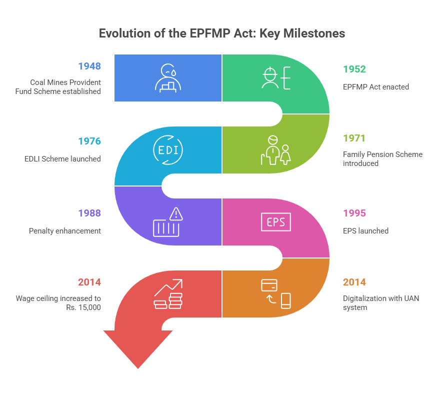 The EPFMP Act emerged from the need to provide social security to industrial workers during India’s early industrialization. Pre-independence, the Coal Mines Provident Fund Scheme, 1948, set a precedent for sector-specific savings. Post-independence, the Constitution’s Directive Principles (Articles 39, 41, 43) emphasized social security, leading to the Act’s enactment under Jawaharlal Nehru’s government. Influenced by ILO conventions, it addressed vulnerabilities of workers in factories, railways, and mines during the First Five-Year Plan (1951-56), which prioritized industrial growth. The EPFO was established in 1952 to implement the Act, starting with regional offices and expanding to over 120 by 2025. Key amendments include the 1971 Family Pension Scheme (replaced by EPS in 1995), EDLI in 1976, and 1988 penalty enhancements. The Act has been amended 15 times by 2016, adapting to globalization (e.g., 1990s economic reforms), digitalization (UAN system, 2014), and pandemics (COVID-19 advances, 2020). By 2025, it covers over 6 crore active members with a corpus exceeding Rs. 20 lakh crore.
