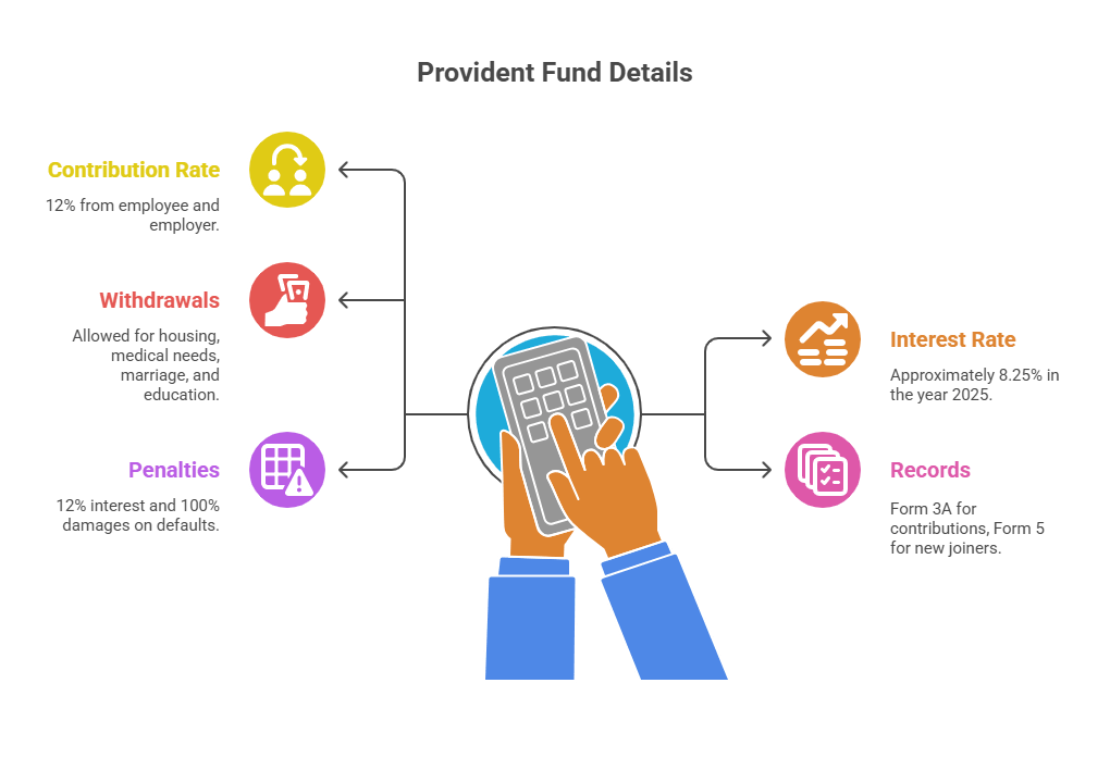 | Provident Fund | 12% employee + employer | Securities, equities | 12% interest, 5-25% damages |