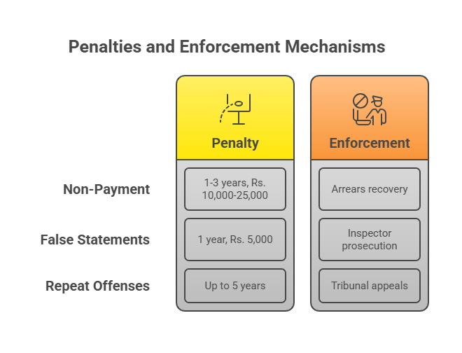Section 14 prescribes penalties: imprisonment up to 1 year and fines up to Rs. 5,000 for evasion or false statements; up to 5 years for repeat offenses. Non-payment of contributions attracts fines of Rs. 10,000-25,000 and 1-3 years imprisonment (Section 14A). Companies face director liability (Section 14AB). Dues are recoverable as land revenue arrears, with property attachment possible. Inspectors enforce via inquiries, audits, and prosecutions, with appeals to tribunals under Section 7I. Cognizance requires government sanction (Section 14AC). Over 50,000 prosecutions annually recover Rs. 500 crore in dues (2024 data). The focus is on compliance, with damages up to 100% for delays.