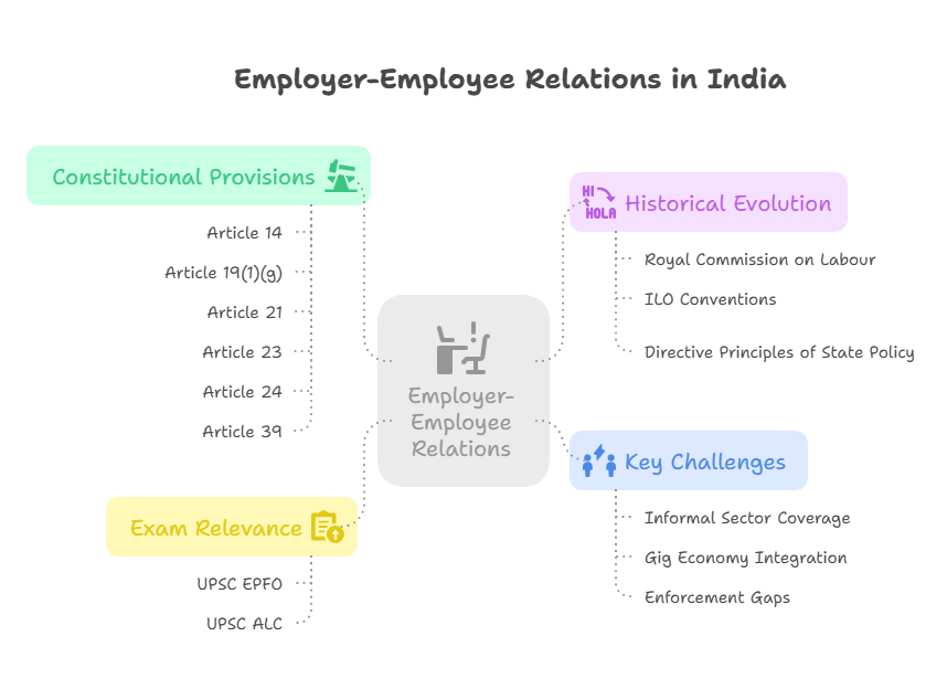 Employer-employee relations, also known as industrial relations, refer to the dynamic interactions between employers (management), employees (workers), and their representatives (trade unions) in the workplace. This field encompasses the regulation of work conditions, dispute resolution, collective bargaining, and social security measures to ensure harmonious and productive labor environments. In the Indian context, it is rooted in constitutional provisions like Articles 14 (equality), 19(1)(g) (freedom to practice occupation), 21 (right to life and dignity), 23 (prohibition of forced labor), 24 (prohibition of child labor), and 39 (directive principles for just work conditions and living wages).