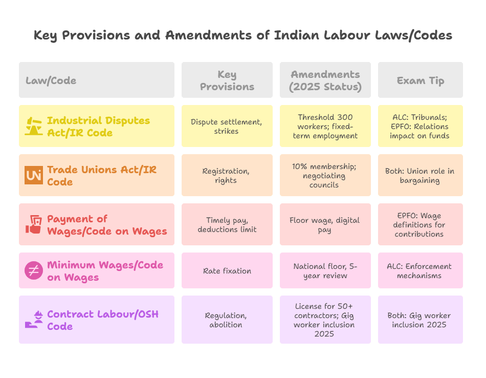 India’s labor framework is consolidated into four Codes (2019-2020), effective in phases from 2025, replacing 29 old laws. Focus on key acts relevant for exams.