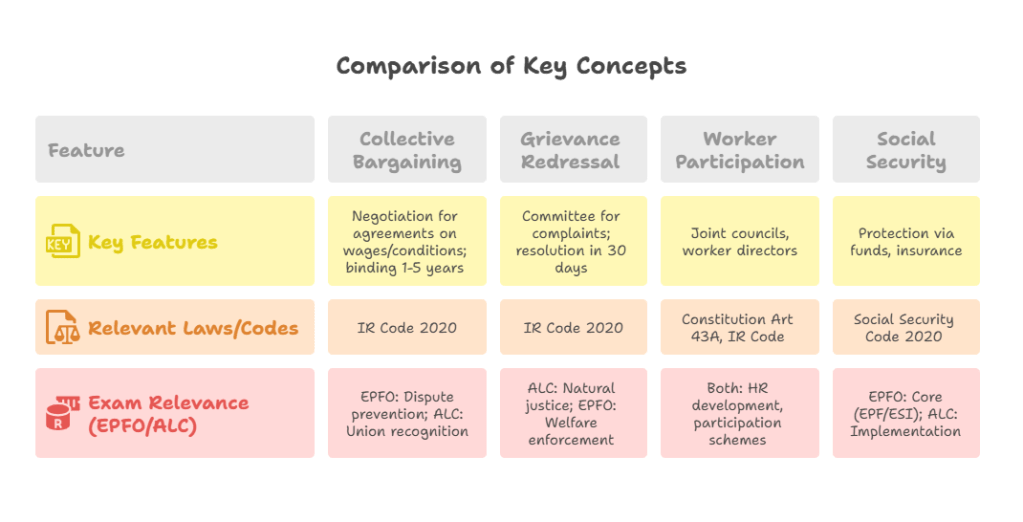 Employer-employee relations involve several core concepts that form the backbone of industrial harmony. These are frequently tested in UPSC exams for their theoretical and practical implications.
