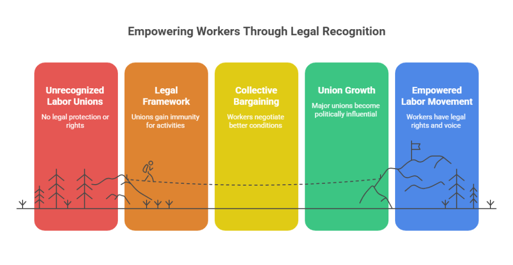 • Legal Recognition: The Act provided trade unions with a legal framework, granting them immunity from civil and criminal liabilities for legitimate activities, which encouraged unionization.