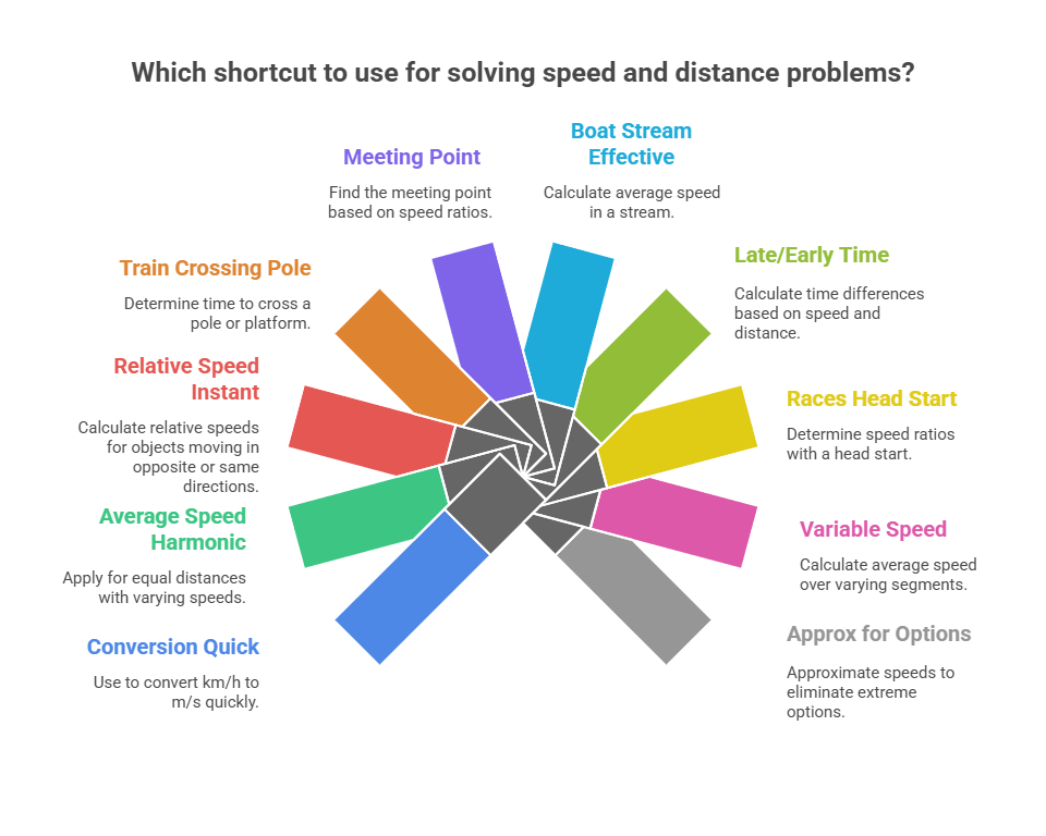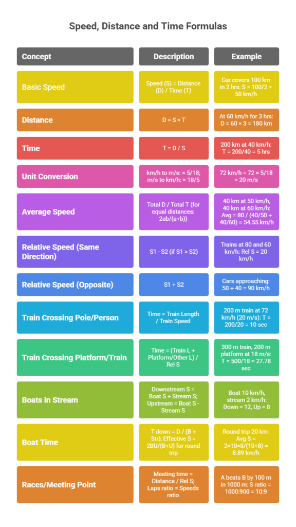 TSD explores the interrelationship between three variables: time (how long), speed (how fast), and distance (how far). It’s foundational for problems involving motion, such as trains crossing platforms, boats in streams, or races. In RBI Grade B, questions emphasize accuracy in conversions, relative motion, and averages, often with twists like varying speeds or meeting points.