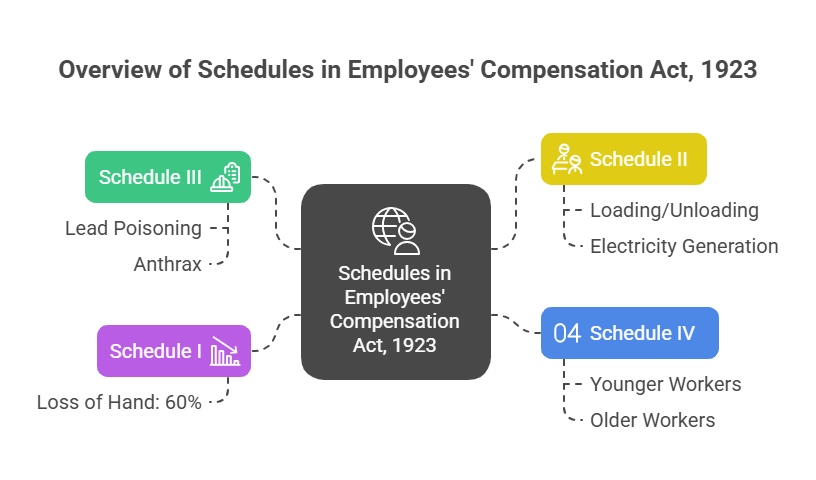 These schedules ensure standardized compensation, reducing disputes. Amendments have expanded Schedule III to include new diseases like COVID-19 for essential workers (2020 notification).