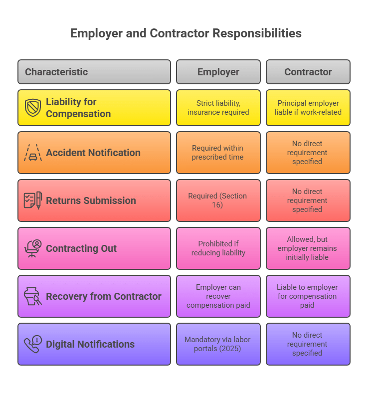 Employers can recover from contractors but must pay first. The Act encourages ESI integration for comprehensive coverage.