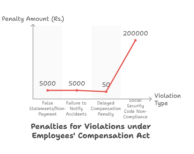 Failure to notify accidents attracts Rs. 1,000-5,000 fines. Commissioners can impose 50% penalty on delayed compensation (Section 4A).