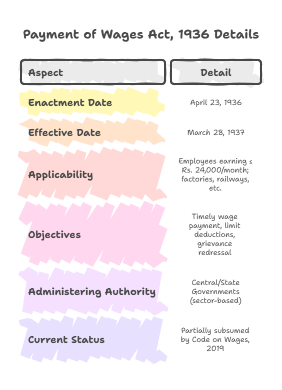The Payment of Wages Act, 1936, is a pivotal labor legislation in India, designed to ensure timely and full payment of wages to workers while preventing unauthorized deductions, thereby safeguarding their financial security. Enacted on April 23, 1936, and effective from March 28, 1937, it primarily targets low-wage workers in industrial and other specified establishments, such as factories, railways, mines, and plantations. The Act applies to employees earning up to Rs. 24,000 per month (as amended in 2017), covering both permanent and contract labor. Administered by state and central governments (based on the sector), it mandates payments in legal tender (coin, currency, cheque, or bank transfer) within stipulated timelines, regulates permissible deductions, and provides mechanisms for grievance redressal. Its objectives include promoting industrial harmony, preventing exploitation, and ensuring workers receive their rightful earnings without delays or arbitrary cuts. For UPSC EPFO and ALC exams, the Act is a core component under “Industrial Relations & Labour Laws,” with significant weightage due to its focus on wage protection and integration into the Code on Wages, 2019 (effective in phases from 2025). The Act remains relevant for addressing issues in organized and unorganized sectors, especially with recent digital payment reforms.