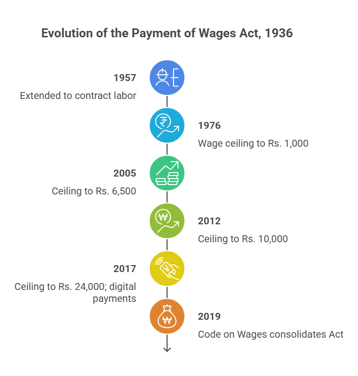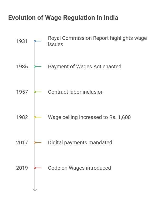 The Payment of Wages Act emerged during British colonial rule to address widespread labor exploitation, particularly in factories and railways, where irregular payments and arbitrary deductions were rampant. Influenced by the Royal Commission on Labour (1929-1931) and ILO conventions, the Act was introduced as a Bill in 1933 to standardize wage practices amid growing trade union movements (e.g., Bombay Textile Strike, 1928). Post-independence, it aligned with India’s socialist policies under the Directive Principles (Articles 39, 43), ensuring worker welfare during rapid industrialization in the 1950s. Key amendments include 1957 (contract labor inclusion), 1964 (wage ceiling to Rs. 400), 1976 (to Rs. 1,000), 1982 (to Rs. 1,600), 2005 (to Rs. 6,500), 2012 (to Rs. 10,000), 2015 (to Rs. 18,000), and 2017 (to Rs. 24,000, digital payments mandated). The 2017 amendment allowed cheque or bank payments for specified establishments, aligning with India’s digital economy push post-demonetization (2016). The Act’s enforcement resolves over 1 lakh claims annually, with the Code on Wages, 2019, introducing a national floor wage and further streamlining provisions for broader coverage, including gig workers, by 2025.
