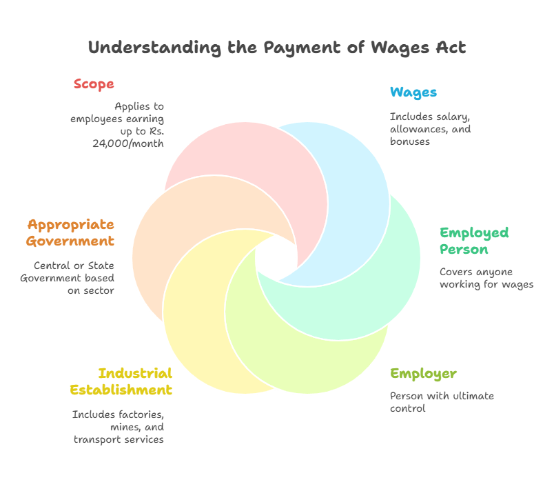 Section 2 of the Act defines key terms to ensure clarity and enforcement. “Wages” (Section 2(vi)) include all remuneration (salary, allowances, overtime, contractual bonuses) but exclude gratuity, travel allowances, pension contributions, and house rent allowance (unless part of contract). An “employed person” (Section 2(i)) covers anyone working for wages, including legal heirs for claiming unpaid wages, and extends to contract labor. “Employer” (Section 2(ia)) is the person with ultimate control, such as owners or managers, including heirs. “Industrial or other establishment” (Section 2(ii)) includes factories, railways, mines, plantations, docks, transport services, and notified entities like shops or hotels. The “appropriate government” (Section 2(iii)) is the Central Government for railways and mines, and State Governments for others. The Act applies to the whole of India, targeting employees with wages up to Rs. 24,000/month, with no minimum employee threshold (unlike EPF Act’s 20). Exclusions include supervisory roles above the ceiling and certain public servants. The scope covers both organized and notified unorganized sectors, with state governments empowered to extend applicability via notifications.