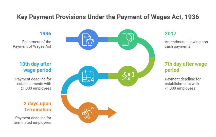 Section 3 mandates that employers are responsible for paying wages to all employed persons, ensuring full and timely disbursal. In large establishments, a nominated person (e.g., manager) may handle payments, but ultimate liability remains with the employer. For contract labor, the principal employer is liable if the contractor fails, preventing evasion in subcontracted setups like construction or manufacturing. Section 4 requires wage periods not to exceed one month, ensuring regular payments (e.g., monthly or fortnightly cycles). Section 5 sets strict timelines: wages must be paid by the 7th day after the wage period for establishments with fewer than 1,000 employees, and by the 10th day for larger ones; upon termination, payment is due within 2 days. Payments must be made on working days, in legal tender (coin, currency, cheque, or bank transfer), with the 2017 amendment allowing governments to mandate non-cash modes for specified sectors to enhance transparency. These provisions reduce financial hardship and ensure accountability, with courts emphasizing strict compliance.