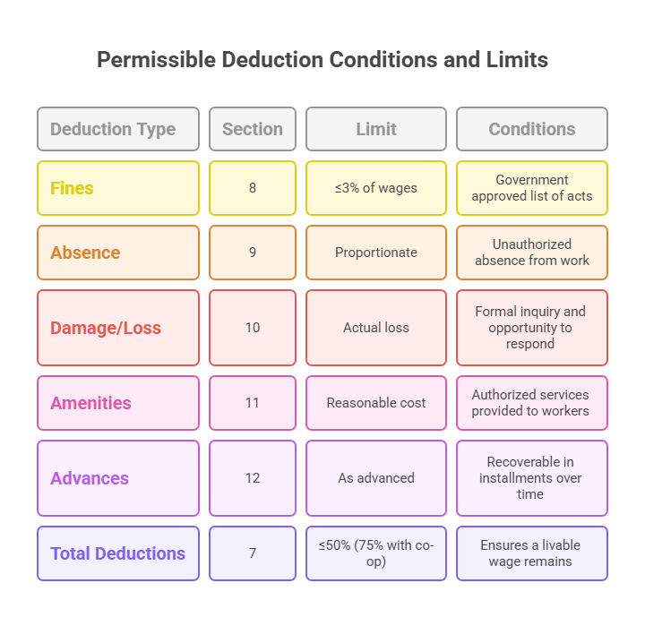 Section 7 restricts deductions to specified categories to protect workers’ earnings. Permissible deductions include fines, absence, damage/loss, amenities, advances, taxes, provident fund contributions, co-operative dues, and court-ordered payments. Total deductions cannot exceed 50% of wages (75% if co-operative dues are included), ensuring workers retain a livable income. Section 8 governs fines, limited to 3% of wages, requiring a government-approved list of acts/omissions, a show-cause notice, and imposition within 1 year of the offense. Fines must fund worker welfare (e.g., canteen facilities). Section 9 allows proportionate deductions for unauthorized absence. Section 10 permits deductions for damage/loss due to negligence, after inquiry and opportunity to respond. Sections 11-13 cover amenities (e.g., housing), advances (recoverable in installments), and overpayment recovery (limited to 3 months prior). These rules balance discipline with fairness, preventing exploitative cuts.