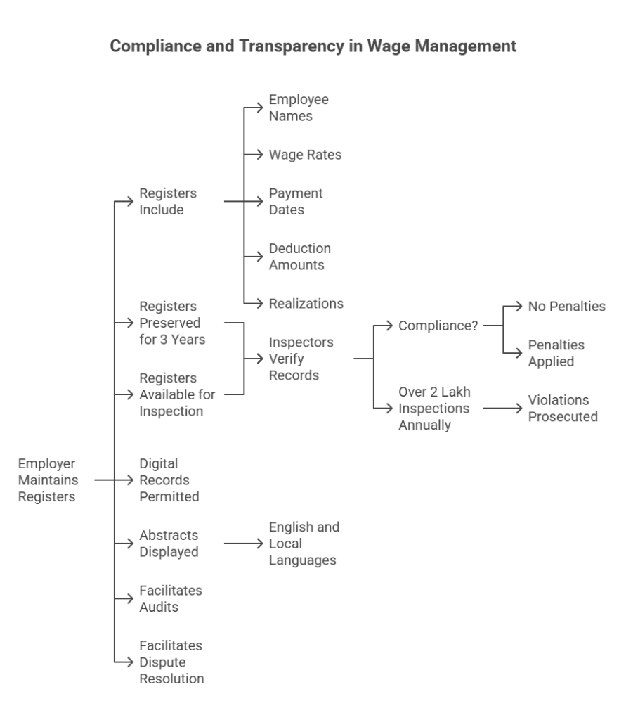 These include employee names, wage rates, payment dates, deduction amounts, and realizations, ensuring transparency. Rules under Section 26 prescribe forms (e.g., wage register with signatures/thumb impressions).