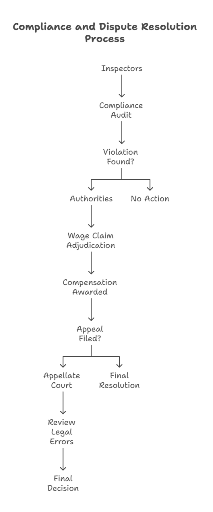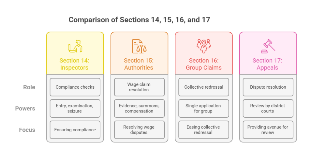 Section 14 appoints inspectors as public servants with powers to enter premises, examine records, question employees, and seize documents to ensure compliance. They conduct over 50,000 inspections yearly, resolving thousands of violations. Section 15 establishes authorities (e.g., labor commissioners, magistrates) to hear claims for delayed or deducted wages, with powers akin to civil courts for evidence and summons. Authorities can award compensation up to 10 times the deducted amount, ensuring deterrence. Section 16 allows single applications for group claims, easing collective redressal. Appeals (Section 17) lie to district courts within 30 days, with employer appeals requiring deposit of awarded amounts. The system emphasizes quick justice, with digital filings introduced post-2020 for efficiency.