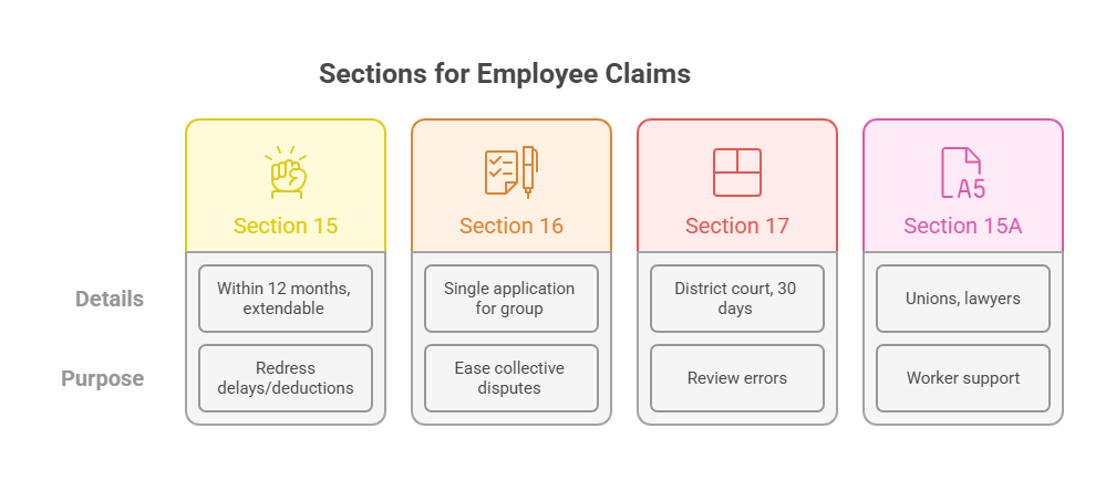 Section 15 enables employees or their representatives (unions, inspectors) to file claims for wrongful deductions or delayed wages within 12 months, extendable for sufficient cause. Authorities can order payment of dues plus compensation (up to 10 times deductions), ensuring punitive measures for violations. Section 16 facilitates group claims, reducing individual burden in factories or mines. Appeals under Section 17 go to district courts, requiring employers to deposit awarded amounts unless waived. Section 15A allows unions or legal practitioners to represent workers, enhancing access to justice. Claims processed digitally via labor portals since 2020 resolve 70% cases within 6 months. The system protects vulnerable workers, with courts interpreting “wages” broadly to include contractual bonuses.