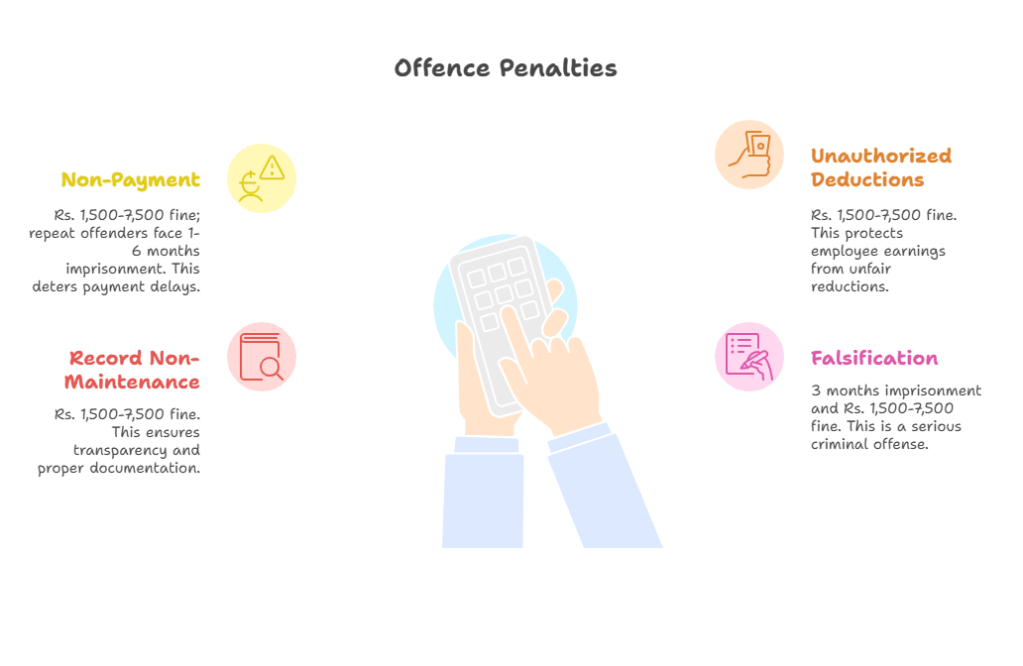 Unauthorized deductions incur Rs. 1,500-7,500 fines. Failure to maintain registers or falsification leads to Rs. 1,500-7,500 fines or 3 months imprisonment.