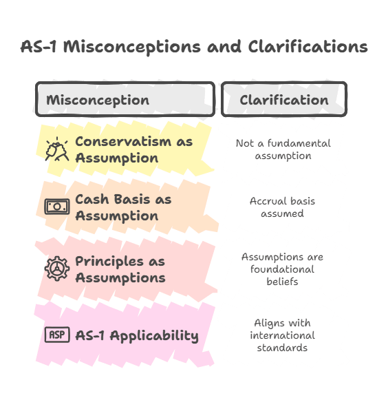 Clarification: Assumptions (like going concern) are foundational beliefs taken for granted unless contradicted, while principles (like conservatism) guide specific accounting treatments. - Misconception 4: AS-1 applies only to Indian entities.