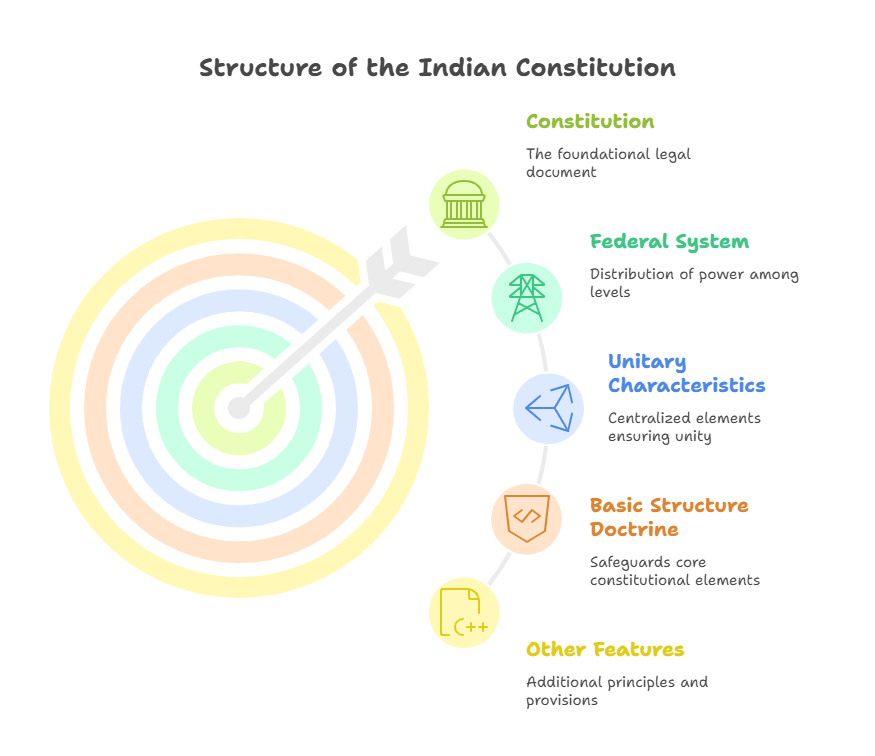 It establishes a federal system with unitary characteristics, featuring a three-tier government (union, state, and local), bicameral legislature at the center, and an independent judiciary. Unitary elements include single citizenship, a strong central government, and integrated judiciary.