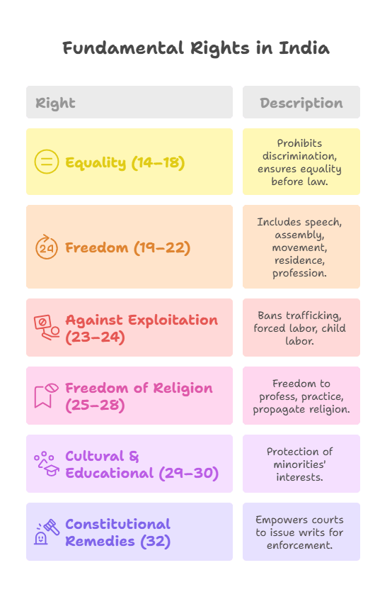 Part III (Articles 12–35) enshrines six categories of justiciable rights enforceable by courts: