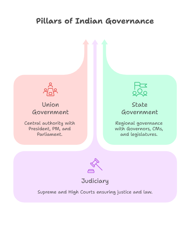 - States (Part VI, Articles 152–237): Include Governors (appointed by President), Chief Ministers and Councils, state legislatures, and high courts. Provisions allow for new states and union territories.