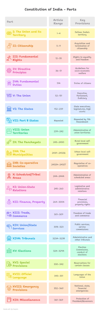 - Union (Part V, Articles 52–151): Comprises the President (elected indirectly), Prime Minister and Council of Ministers, Parliament (Lok Sabha and Rajya Sabha), and Supreme Court.