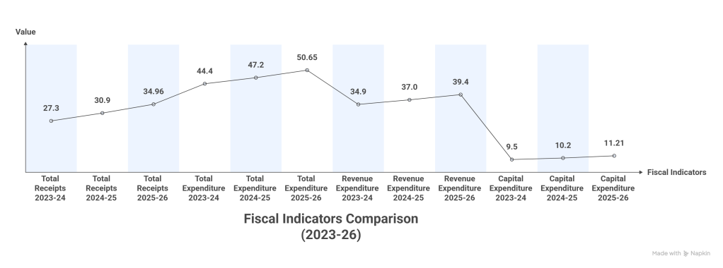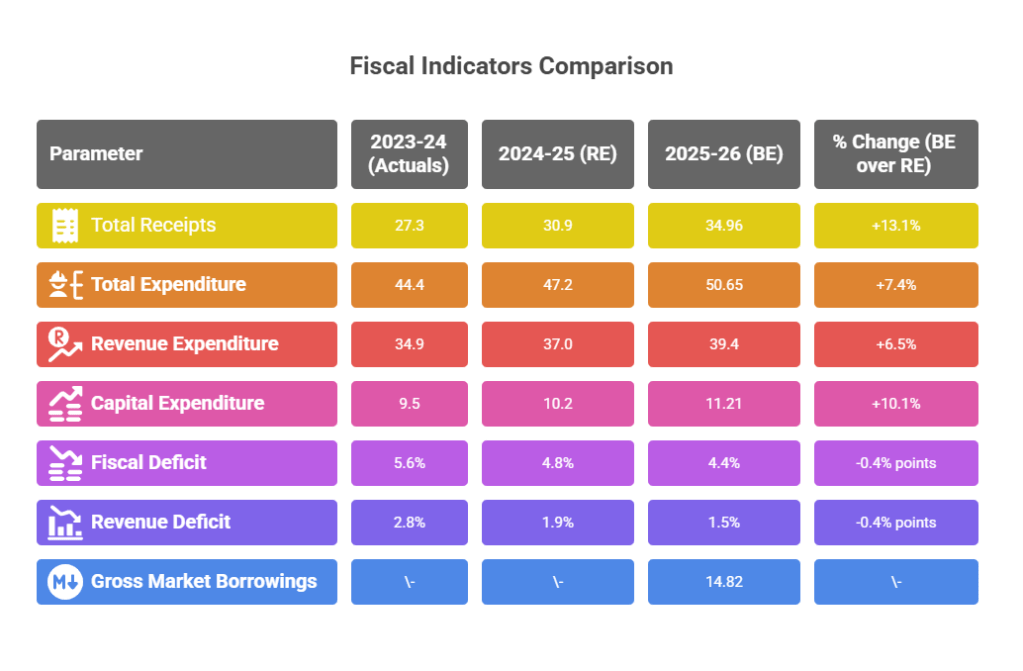 The budget projects a balanced approach to fiscal management, with a focus on reducing deficits while increasing capital expenditure. Key fiscal indicators are summarized in the table below, based on budget estimates (BE), revised estimates (RE), and actuals from previous years.