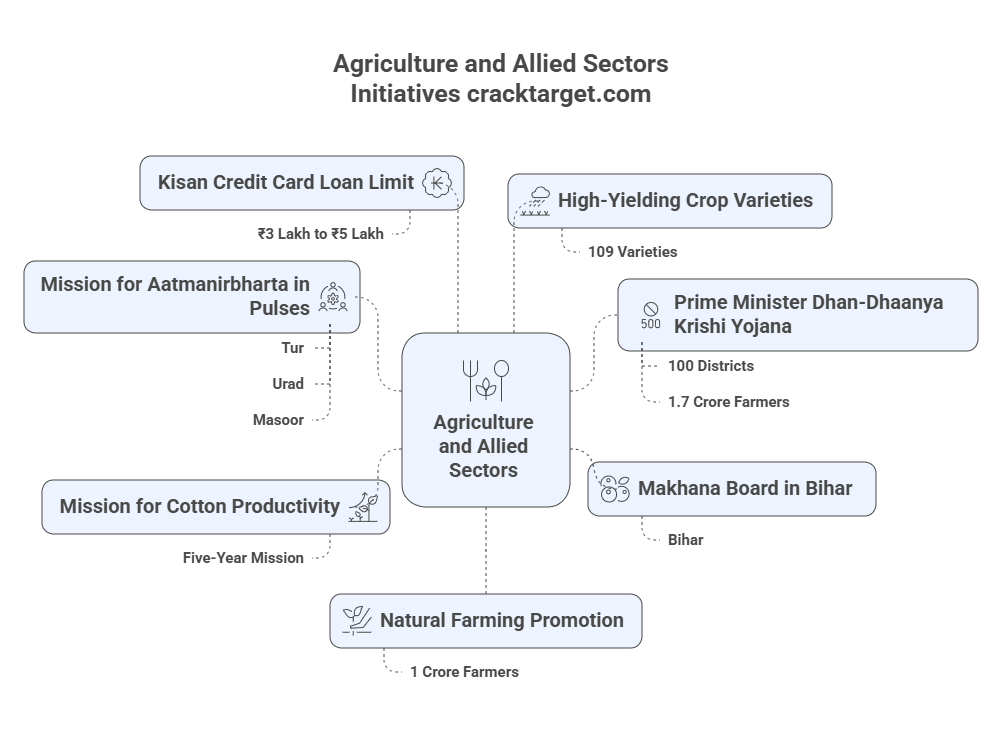 - Agriculture as the Primary Engine: Initiatives focus on productivity enhancement, self-reliance in key crops, and farmer welfare.