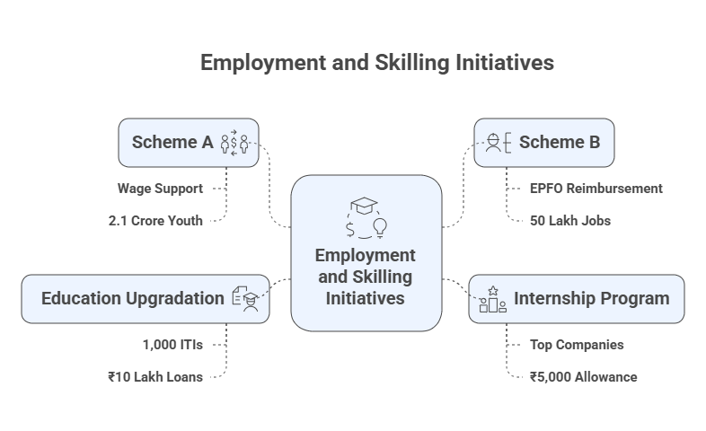 - Scheme A: Wage support up to ₹15,000 for first-time formal sector entrants, benefiting 2.1 crore youth.