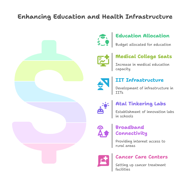 - Addition of 10,000 medical college seats and infrastructure in five IITs for 6,500 students.