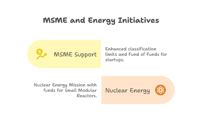 - Enhanced MSME classification limits and ₹10,000 crore Fund of Funds for startups.