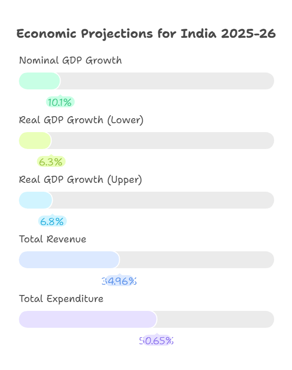Nominal GDP growth is estimated at 10.1% for 2025-26, with real GDP projected between 6.3% and 6.8%. The budget anticipates total revenue of ₹34.96 trillion and expenditures of ₹50.65 trillion, supporting inclusive growth amid global uncertainties.