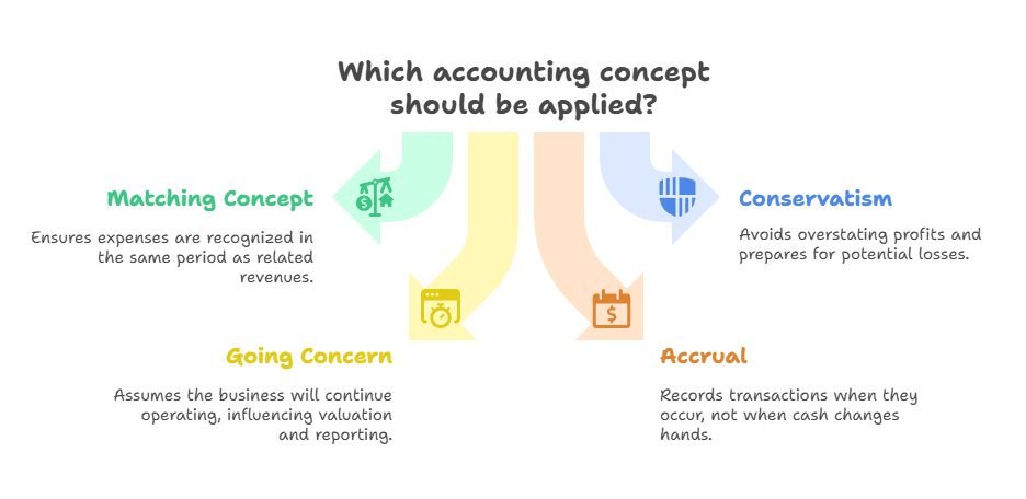 - Accrual: Record income/expenses when earned/incurred, not when cash received/paid.
